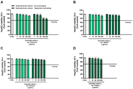 Cytotoxicity of the organic extracts obtained from the June- and September-harvested inflorescences of the different varieties of Cannabis sativa L in human hepatoma HepG2 cells determined using MTT assay after 24 h of exposure. (A) C. sativa var. Felina 32; (B) C. sativa var. USO31; (C) C. sativa var. Ferimon; (D) C. sativa var. Fedora. The data are displayed as mean ± SE of at least three independent experiments (n = 3). ** p < 0.01 and *** p < 0.001 vs. control (one-way ANOVA followed by Dunnett’s multiple comparison post-test).