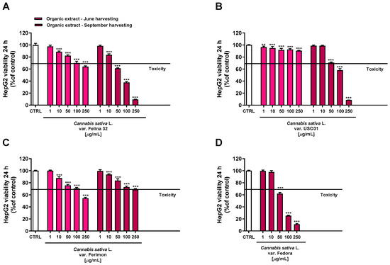 Cytotoxicity of organic extracts obtained from the inflorescences of different varieties of Cannabis sativa L in human hepatoma HepG2 cells determined by LDH release assay after 24 h of exposure. (A) C. sativa var. Felina 32 organic extract from September harvesting; (B) C. sativa var. USO31 organic extract from September harvesting; (C) C. sativa var. Ferimon organic extract from June harvesting; (D) C. sativa var. Fedora organic extract from September harvesting. The data are displayed as mean ± SE of at least three independent experiments (n = 3). *** p < 0.001 vs. control (one-way ANOVA followed by Dunnett’s multiple comparison post-test).