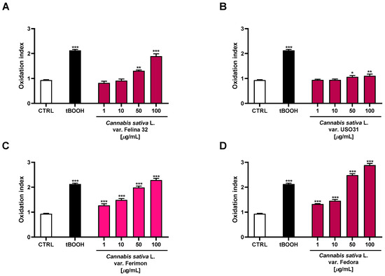 Effects of the organic extracts from the hemp varieties and of the positive control tBOOH (500 μM) on the intracellular ROS levels in HepG2 cells (A) C. sativa var. Felina 32 organic extract from September harvesting; (B) C. sativa var. USO31 organic extract from the September harvest; (C) C. sativa var. Ferimon organic extract from the June harvest; (D) C. sativa var. Fedora organic extract from September harvesting. ROS levels are expressed as oxidation index with respect to the basal levels. The data are mean ± SE from at least three independent experiments (n = 3). * p < 0.05, ** p < 0.01, and *** p < 0.001 vs. control (one-way ANOVA followed by Dunnett’s multiple comparison post-test).