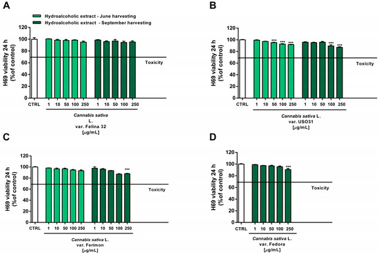Cytotoxicity of the hydroalcoholic extracts obtained from the June- and September-harvested inflorescences of the different varieties of Cannabis sativa L in human H69 noncancerous cholangiocytes determined via MTT assay after 24 h of exposure. (A) C. sativa var. Felina 32; (B) C. sativa var. USO31; (C) C. sativa var. Ferimon; (D) C. sativa var. Fedora. The data are displayed as mean ± SE of at least three independent experiments (n = 3). *** p < 0.001 vs. control (one-way ANOVA followed by Dunnett’s multiple comparison post-test).