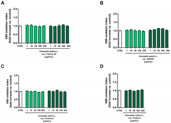 Effects of the hydroalcoholic extracts from the hemp varieties on the intracellular ROS levels in human H69 noncancerous cholangiocytes after 24 h of exposure. (A) C. sativa var. Felina 32; (B) C. sativa var. USO31; (C) C. sativa var. Ferimon; (D) C. sativa var. Fedora. The data are displayed as mean ± SE of at least three independent experiments (n = 3).