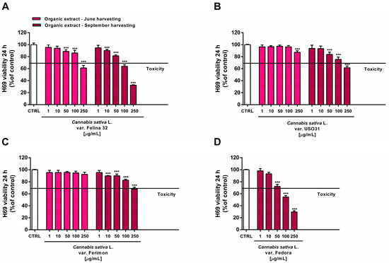 Cytotoxicity of the organic extracts obtained from the June- and September-harvested inflorescences of the different varieties of Cannabis sativa L in human H69 noncancerous cholangiocytes determined via MTT assay after 24 h of exposure. (A) C. sativa var. Felina 32; (B) C. sativa var. USO31; (C) C. sativa var. Ferimon; (D) C. sativa var. Fedora. The data are displayed as mean ± SE of at least three independent experiments (n = 3). *** p < 0.001 vs. control (one-way ANOVA followed by Dunnett’s multiple comparison post-test).