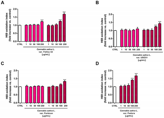 Effects of the organic extracts from hemp varieties on the intracellular ROS levels in human H69 noncancerous cholangiocytes after 24 h of exposure. (A) C. sativa var. Felina 32; (B) C. sativa var. USO31; (C) C. sativa var. Ferimon; (D) C. sativa var. Fedora. The data are displayed as mean ± SE of at least three independent experiments (n = 3). ** p < 0.01, and *** p < 0.001 vs. control (one-way ANOVA followed by Dunnett’s multiple comparison post-test).