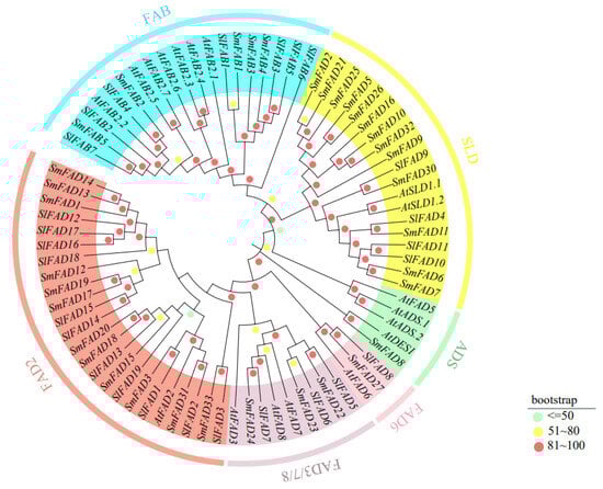 Phylogenetic tree of FAD genes. At: Arabidopsis; Sl: tomato; Sm: eggplant. FAD3/7/8: δ-15 desaturase; FAB: stearoyl-ACP desaturase; FAD2/FAD6: δ-12 desaturase; ADS/SLD: anterior end desaturase.