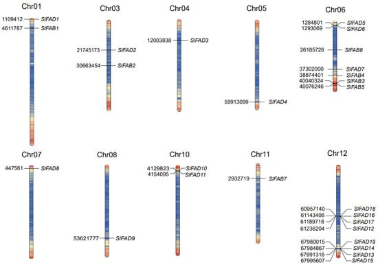 Distribution of SlFAD gene family members on chromosomes. Different colors indicate different gene densities; the redder the color, the greater the gene density; the bluer the color, the lower the gene density.