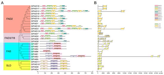 Conserved motifs and structural characterization of SlFAD. (A) The 10 conserved motifs of the SlFAD protein are represented by colored rectangles, and different branches are marked with different background colors. (B) Gene structure of SlFAD: CDS indicates coding region; UTR indicates non-coding region; Intron indicates intron.