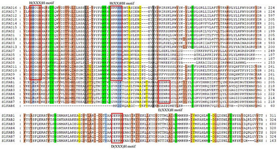 SlFAD conserved sequence analysis. Sequence comparison was performed using DNAMAN, and the 3 conserved histidine motifs were marked with red boxes.