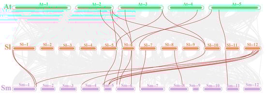 Co-lineage pairs of the tomato FAD gene with Arabidopsis and eggplant. Red lines highlight homologous gene pairs of SlFAD genes with Arabidopsis, and gray lines indicate genome-wide covariate gene pairs.