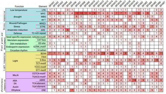 The number of cis-acting elements included in the promoters of SlFADs. The number of cis-acting elements involved in different regulatory pathways varies. A darker red color indicates a higher number of cis-acting elements and a lighter red color indicates a lower number of cis-acting elements. Different background colors indicate different types of response elements.