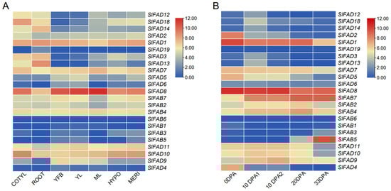 Analysis of expression patterns of SlFADs in different tissues and during fruit development. (A): expression patterns of SlFADs in different tissues; (B): expression patterns of SlFADs in different fruit development periods; COTYL: cotyledons; ML: mature leaves; YL: young leaves, YFB: young buds; ROOT: roots; HYPO: hypocotyls; MERI: meristematic tissues; DPA: days after anthesis.