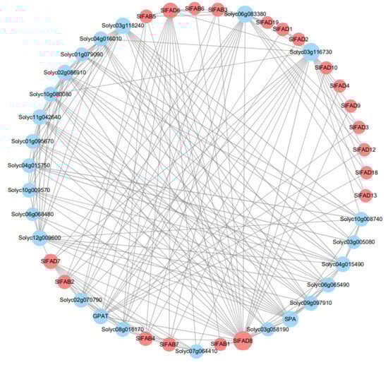 Member of the SlFAD gene family protein–protein interaction network. Each node is a protein. Each gray line represents interaction presence, and node size indicates the number of interactions. Red nodes represent SlFAD proteins and blue nodes represent proteins that interact with SlFAD.