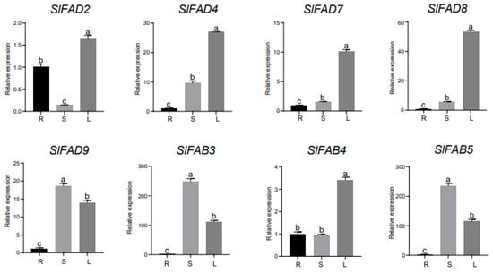 Expression analysis of SlFAD gene in roots, stems, and leaves. R: roots; S: stems; L: leaves. a–c: highly significant level of difference (p < 0.01). Error bars show the standard deviation of three biological replicates.