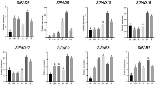 Under the treatment of 200 mmol·L−1 NaCl simulated salt stress, many genes also produced positive responses (Figure 10 and Figure S2). The expression levels of SlFAD6, SlFAD9, and SlFAD10 were all up-regulated compared with the control group, reaching a peak at 8 h. Among them, the expression level of SlFAD9 was the most significant compared to the control, which was 33 times that of 0 h. The response levels of SlFAD1, SlFAD2, and SlFAD7 showed a trend of first increasing and then decreasing over time. The expression patterns of SlFAD14, SlFAD16, and SlFAD17 were just the opposite, with their response levels decreasing first and then increasing over time. The overall expression of members of the soluble FADs subfamily was up-regulated, and the time to reach the maximum value varied for different genes. Most genes began to show their regulatory effects after 4 h of treatment. This may indicate that members of this subfamily are closely related to tomato’s response to abiotic stress. The remaining genes were down-regulated to varying degrees.