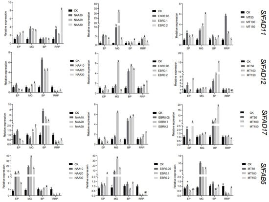The response mechanism of tomato FAD genes was explored using different concentrations of naphthaleneacetic acid, brassinosteroid, and melatonin (Figure 11). Through analysis, it can be found that all genes are strongly induced by EBR at a concentration of 0.1 mg·L−1 during the green mature period, indicating that it plays an important role in the early stage of fruit development (Figures S2–S6). Members in the FAD2 branch are significantly up-regulated under NAA, EBR, and MT hormone treatment as a whole, and they all show obvious regulatory effects during the color-changing period. Among them, the expression level of the SlFAD17 gene under MT treatment is the highest, which is 18 times that of the control group. Members in the FAD3/7/8 branch are generally up-regulated under different hormone treatments. What is different is that most members show significant differences in the later stage of fruit development, and the response is most intense under NAA and MT treatment at a concentration of 30 mg·L−1 and 50 mg·L−1 during the red mature period. Most members in the FAB subfamily have a more obvious effect in the early and middle stages of fruit development. Among them, the SlFAB5 gene has significant differences compared with the control group under three hormone treatments at all times, indicating that the SlFAB5 gene may regulate all stages of fruit development.
