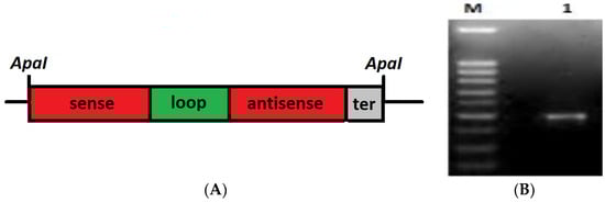 (A) Structure of the GIP-silencing cassette. (B) Visualization of the synthesized cassette on agarose gel (M) DNA ladder of 100 bp; (1) the GIP-silencing cassette (551 pb).