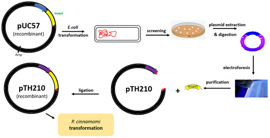 Two vectors were used in this study: pUC57 and pTH210. The pUC57 has 2710 bp and contains the ampicillin resistance gene. This plasmid was used for cloning the GIP-silencing cassette and therefore transformed E. coli to propagate the construct. On the other hand, pTH210 has 5030 bp, is driven by the Hsp70 promoter, and contains the hygromycin resistance gene. This vector was used to insert the GIP-silencing cassette into the genome of P. cinnamomi.