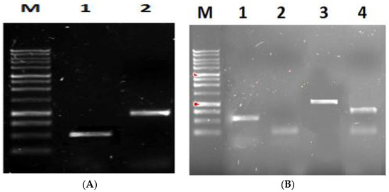 To assess and refine the DNA fragments, electrophoresis was conducted in a 0.8% (w/v) agarose gel within TAE buffer (Tris-Acetate 40 mM, 1 mM EDTA), supplemented with 0.5 μg/mL of GreenSafe Premium (NZYtech, Lisbon, Portugal). The electrophoresis was performed for 40 min at room temperature under 80 V [1]. Subsequently, by using the ChemiDoc™ XRS+ imaging system, 6.1 Software for Windows (BioRad, Hercules, CA, USA), the gel was irradiated to visualize and determine the size and intensity of the target DNA band by comparing it to DNA ladders.