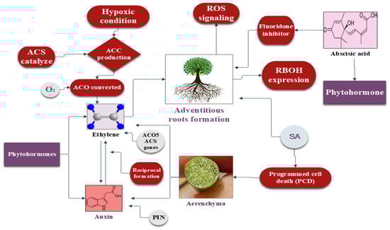 Ethylene works as a gaseous hormone in plants, and its diffusion rate is significantly reduced during flooding stress [160]. However, plants have established an adaptive mechanism to accumulate more ethylene to respond to flooding stress. This accumulation is facilitated by the production of 1-aminocyclopropane-1-carboxylic acid (ACC), which serves as the precursor of ethylene production [161]. Under hypoxic conditions, ACC synthase (ACS) catalyzes large quantities of ACC, whereas ACC oxidase (ACO) converts ACC into ethylene in the presence of a small amount of oxygen (O2) [162]. Therefore, the continuous transfer of ACC is necessary, from the hypoxic root system to the lower part of the plant’s aerobic region, for a continuous oxidation reaction to produce ethylene [163]. Asgher [164] reported the activation of the ACO5 and ACS genes during waterlogging in Arabidopsis, resulting in ethylene biosynthesis taking place. AR development is based on the synthesis of ethylene under flooding stress [163]. In [122], the authors observed the expression of the ACO5 and ACS genes in rice developing ARs and aerenchyma under flooding conditions [165]. Sasidharan and Voesenek [166] reported that ethylene (ET) caused cell death during lysogenic aerenchyma, whereas lysosomal aerenchyma cells developed in wheat, maize, and rice during ET accumulation [122,167]. Moreover, ethylene enhances the biosynthesis of IAA in plants facing flooding stress, which further increases the plant’s vegetative growth, which is responsible for its tolerance of and escape from high-water-stress situations [168].