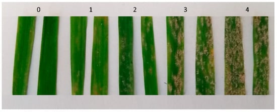 The level of infection of the tested cultivars was determined ten days after infection with the isolates using the modified Mains scale [30], where 0 = no visible symptoms; 1 = very resistant, single colonies; 2 = intermediate resistance, moderate mycelium sporulating; 3 = moderately susceptible, extensive mycelium, more sporulation; and 4 = highly susceptible, large colonies, and abundant sporulation (Figure 1). To confirm the response of the tested cultivars to the used B. graminis f. sp avenae isolates, all tests were performed in three replications. In the cases when the genotype response to the applied isolate in the replications was different, as a result, the highest score was taken.