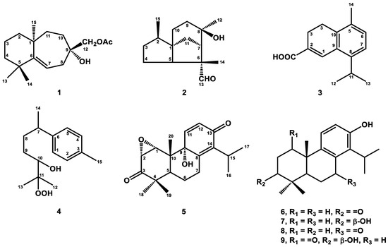 By comparing the spectroscopic data ([a]D, UV, IR, NMR, and MS) of known compounds with the literature data, the known diterpenes were identified to be totarolone (6) [41], 3β-hydroxytotarol (7) [42], 7-oxototarol (8) [41], and 1-oxo-3β-hydroxytotarol (9) [41], 5,6-dehydrosugiol methyl ether (10) [43], sandaracopimaric acid (11) [35], 3,18-dihydroxypimara-8(14),15-diene (12) [44], secoabietane dialdehyde (13) [43], communic acid (14) [43], and (12R, 13S)-dihtdroxylabda-8(17),14-dien-19-oic acid (15) [45]. Additionally, the known sesquiterpenes were identified to be 2-himachalen-6-ol (16) [36], 3-himachalen-6-ol (17) [36], chinensiol (18) [36], ar-himachalene (19) [36], 12-hydroxy-α-longipinene (20) [35], 15-hydroxyacora-4(14),8-diene (21) [35], cedrol (22) [35], 8α,12-cedranediol (23) [46], 8-cedren-13-ol (24) [8], epicedrane-diol (25) [47], cedrol-13-oic acid (26) [48], 13-acetoxycedrol (27) [48], widdrol (28) [35], (+)-α-bisabolol (29) [7], sesquithuriferol (30) [8], 15-hydroxyallo-cedrol (31) [7], thujopsenal (32) [35], hinokiic acid (33) [35], mayurone (34) [49], 4α,5α-epoxymayurone (35) [50], 8β-hydroxythujopsan-9-one (36) [51], nootkatone (37) [52], and γ-cuparanol (38) [53].