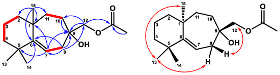 Compound 1 was obtained as a colorless, viscous oil with optical rotation. Its molecular formula was determined as C17H28O3 from HRESIMS data (m/z 281.2101 [M+H]+ (calcd. for 281.2117)), implying four degrees of unsaturation. The infrared spectroscopy (IR) spectrum showed typical absorptions of C=O (1742 cm−1) for the ester group and hydroxy group (3433 cm−1). The 1H NMR spectrum (Table 1) displayed signals of four singlet methyl groups at δH 1.04 (3H, s, H-14), 1.07 (3H, s, H-13), 1.20 (3H, s, H-15), and 2.10 (3H, s, OAc), one oxymethylene at δH 3.99 (2H, s, H-12), and one trisubstituted olefinic proton at δH 5.41 (1H, dd, J = 8.8, 6.0 Hz, H-7). The 13C NMR (Table 2) and DEPT spectra showed seventeen resonances comprising four methyls, seven methylenes, one methine, and five quaternary carbons. From the 1H and 13C NMR spectra, one C=O group (δC 171.3, C-16) and one C=C unit [δC 116.3 (C-7), 155.2 (C-6)] accounted for two of four degrees of unsaturation. Thus, compound 1 was suggested to be a bicyclic sesquiterpene with an acetyl group. The existence of the acetoxy methyl group was confirmed by the HMBC correlation (Figure 2) from H-17 to C-16 and the absorption of the ester group (1742 cm−1) in the IR spectrum. Comparing the 1H and 13C NMR data of 1 to those of the literature compound, widdrol [6], they shared similar structures, except for the oxidation of C-12 and an additional acetyl group in 1. Further HMBC correlation (Figure 2) between H-12 and C-16 allowed the acetoxy group to be located at C-12. The relative stereochemistry of 1 was assigned using the information provided by the NOESY spectrum (Figure 2) and compared with the literature compound, widdrol [6]. The NOESY correlations (Figure 2) between H-13/H-8α and H-15, and H-12/H-8β, confirmed that OH-9, H-13, and H-15 were in the same phase, while H-12 and H-14 were on the same side. Thus, compound 1 was determined and named 12-acetoxywiddrol.