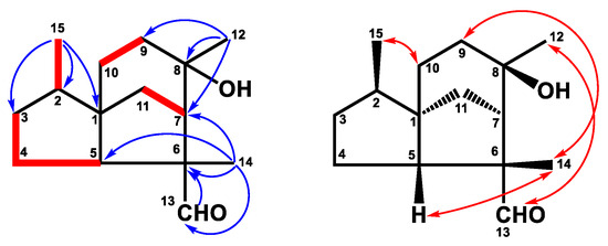 Compound 2 was isolated as an optical, viscid oil, and displayed a pseudo-molecular ion at m/z 237.1848 [M+H]+ (calcd. for C15H25O2, 237.1855) by HRFABMS with four degrees of unsaturation. Its IR spectrum showed hydroxy and aldehyde groups at 3403 cm−1 and 1711 cm−1, respectively. The 1H NMR data (Table 1) depicted signals of three methyls at δH 0.84 (3H, d, J = 6.9 Hz, H-15), 1.31 (3H, s, H-12), and 1.41 (3H, s, H-14), and an aldehyde group with low field chemical shift at δH 9.42 (1H, s, H-1). Further 13C NMR (Table 2) and DEPT spectra identified three methyls, five methylenes, three methines, and four quaternary carbons, including one oxygenated quaternary carbon (δC 73.8) and one aldehyde (δC 205.6). According to the above data, the structure of 2 was assumed to be a three-membered ring sesquiterpene with an aldehyde group. A detailed comparison of the NMR data of 2 to those of 8β,13-dihydroxycedrane [40] revealed that these two compounds were structure analogous, except for the hydroxymethyl group of 8β,13-dihydroxycedrane was changed to an aldehyde group in compound 2. The HMBC correlations (Figure 3) from H-14 to C-5 (δC 58.0), C-6 (δC 57.6), C-7 (δC 53.3), C-13 (δC 205.6), and H-13 (δH 9.42, 3H, s, H-13) to C-6 indicated that the aldehyde group was located at C-6. In the HMBC spectrum, the correlations of H-12/C-7, C-8 (δC 73.8), and C-9 (δC 34.6) verified the hydroxy group was attached at C-8. The planar structure of 2 was further supported by HMBC and COSY correlations, as shown in Figure 2. Further NOESY correlations (Figure 3) between H-15/H-10, H-14/H-5, H-9, and H-12/H-13 supported the relative configuration of 2 was the same as 8β,13-dihydroxycedrane [40]. Based on the above data, the structure of compound 2 was determined and named cedrol-13-al.