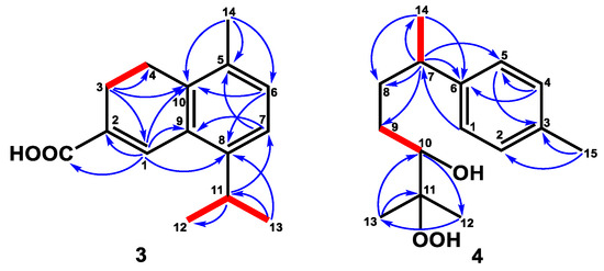 Key 1H–1H COSY (━) and HMBC (H→C) correlations of compounds 3 and 4.