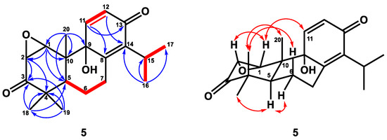 Compound 5 was obtained as a colorless crystal with optical rotation. A molecular formula of C20H26O4 was determined for this compound by HRESIMS (m/z 331.1906, calcd. for 331.1909), with eight degrees of unsaturation. The IR spectrum of 5 showed IR absorption bands at 3417 cm−1 for a hydroxy group, at 1699 cm−1 for one carbonyl group [δC 211.0 (C-3)], and at 1669 cm−1 for one conjugated carbonyl group [δC 184.6 (C-13)], which was supported by analysis of the 13C NMR spectrum (Table 2). The IR spectrum also revealed the presence of C=C double bonds (1631, 990, 840 cm−1). The 1H NMR spectrum of 5 exhibited three singlet methyl groups [δH 0.71 (3H, s, H-20), 0.98 (3H, s, H-19), and 1.20 (3H, s, H-18)], an isopropyl group [δH 1.21 (3H, d, J = 7.2 Hz, H-17), 1.23 (3H, d, J = 7.2 Hz, H-16)], and 3.22 (1H, sept, J = 7.2 Hz, H-15)], two oxymethines [δH 3.38 (1H, d, J = 4.6 Hz, H-2), 3.64 (1H, d, J = 4.6 Hz, H-1)], and double-bond signals [δH 6.28 (1H, d, J = 10.0 Hz, H-12), 7.01 (1H, d, J = 10.0 Hz, H-11)]. The 13C NMR and DEPT spectra indicated the presence of five methyls [δC 13.9 (C-20), 20.8 (C-19), 21.4 (C-17), 21.5 (C-16), 28.4 (C-18)], two oxymethines with epoxy ring [δC 54.5 (C-2), 60.9 (C-1)], one oxygenated quaternary carbon [δC 74.2 (C-9)], two pairs of double bonds [δC 131.3 (C-12)/144.9 (C-11), 144.0 (C-14)/153.7 (C-8)], two carbonyl groups [δC 184.6 (C-13), 211.0 (C-3)], two quaternary carbon [δC 44.8 (C-4), 46.7 (C-10)], two methines [δC 26.6 (C-15), 38.6 (C-55)], and two methylenes [δC 24.0 (C-6), 26.6 (C-7)]. From the above spectroscopic data, 5 was assumed to be a totarane diterpene similar to totarolone [41], except for an additional epoxy group at C-1/C-2, a hydroxy group at C-9, and the aromatic ring in totarolone was changed to a cyclohexa-2,5-dien-1-one ring in 5. The HMBC correlations (Figure 5) between H-20/C-1; H-1/C-2, C-5, and C-10; and H-2/C-3, C-4 indicated C-1 and C-2 were connected with epoxy group. Moreover, the cis disposition of H-1/H-2 was confirmed by the small coupling constant of H-1/H-2 (J = 4.6 Hz). The hydroxy group was located at C-9 from HMBC correlations of H20/C-9 and H-12/C-9. The existence of the cyclohexa-2,5-dien-1-one unit was verified based on the HMBC correlations between H-11/C-8, C-13 and H-12/C-9, C-14. The NOESY correlation (Figure 5) between H-19/H-6β, H-20 and H-5/H-6α, H-18, indicating H-19 and H-20 were in axial position. The NOESY correlations of H-1/H-2 and H-11 suggested that H-1, H-2, and H-11 were in the same phase (Figure 5). Additionally, the epoxy group and OH-9 were at the α-position based on the ring junction afforded by NOESY correlations. Thus, the structure of compound 5 was elucidated as 1β,2β-epoxy-9α-hydroxy-8(14),11-totaradiene-3,13-dione.