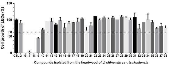 The role of lymphangiogenesis in tumor development, progression, and metastasis has been well-documented in various human cancers. Therefore, our study focused on examining the anti-lymphangiogenic effects of 34 compounds in human lymphatic endothelial cells (LECs). As shown in Figure 6, compounds 6–9 showed growth-inhibitory effects on LECs (the percentage of LECs growth < 60%). These active isolates were further evaluated for their IC50 values of anti-lymphangiogenic activity (Table 3). As shown in Table 3, totarolone (6) exhibited the most potent anti-lymphangiogenic activity by suppressing LEC growth (IC50 = 6 ± 1 µM), with rapamycin as the positive control. 3β-Hydroxytotarol (7), 7-oxototarol (8), and 1-oxo-3β-hydroxytotarol (9) showed moderate growth-inhibitory effects on LECs with IC50 values of 29 ± 1, 28 ± 1, and 45± 2 µM, respectively.