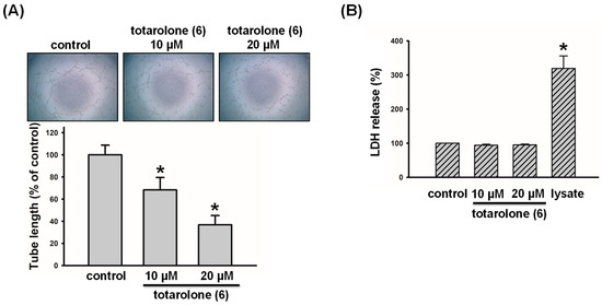 Effects of compound 6 on tube formation and cytotoxicity in human LECs. (A) Cells were treated with compound 6 (10 and 20 μM) for 8 h, and tubular morphogenesis was recorded by an inverted phase-contrast microscope (n = 3). ImageJ 1.54a software was used to quantify the length of capillary-like tubes. (B) LECs were treated with compound 6 (10 and 20 μM), then the cytotoxicity was evaluated by the LDH assay (n = 3). Data are expressed as the mean ± SEM. * p < 0.05 compared with the control group.
