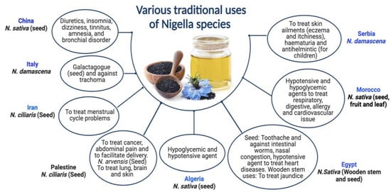 N. ciliaris and N. damascena species of Nigella have been shown to provide various health benefits. Although N. damascena has been used since the Bronze Age in Central Europe, its ethnobotanical significance cannot be conclusively established. Its origins are still unknown; it has never been seen growing wild in Central Europe [36]. N. damascena seeds are a galactagogue in traditional Sicilian medicine [37]. In Serbian mediaeval medicine, this plant is also a helmintic agent to cure skin conditions like hematuria [38]. Italy and Tunisia traditionally use N. damascena for treating trachoma [39]. In addition to being used as an herbal cure, N. damascena is a condiment in several places [36], including Morocco [40]. N. ciliaris seeds are used in the traditional medicine of Palestine and Iran to cure menstrual cycle-related issues, ease childbirth, and relieve stomach discomfort [41,42]. The dried blossoms of N. arvensis are used to make winter tea in the Turkish city of Meriç Town [43]. In Iran (Kerman), however, a mixture of N. arvensis seed flour and other seeds is administered to enhance male potency and increase memory and intelligence [43,44]. Both Nigella species’ seeds are used for treating cancer in Palestine [45,46]. Formulation of black cumin essential oil nanoemulsions (BCO-NE) using different ratios of essential oil with canola and flax seed oils (ripening inhibitors) were formulated and stabilized with octenyl succinic anhydride (OSA) modified waxy maize starch for the antimicrobial use [47]. Pioglitazone is incorporated into a nanoemulsion formulation prepared with NSO to boost the action of Pioglitazone [48]. Numerous individuals use the oil to treat skin disorders like eczema, psoriasis, and blisters. Black seed oil combined with beeswax is also used as a moisturizer, anti-wrinkle agent, burn salve, and treatment for skin infections and joint discomfort. Various traditional uses of Nigella species are exhibited in Figure 1.