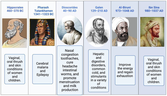 Religious texts have mentioned the names of medicinal plants, their preparation, and their significance [49,50]. The Prophetic Medicine and the Bible, two essential works from the Ancient and New Testaments, refer to NS (Isaiah 28:25:27 and Matthew 23:23). NS is mentioned more often than any other plant in the Bible. It is used for both birth control and cancer therapy [51]. According to Hippocrates, Dioscorides, and Pliny, NS is the medicinal “black cumin” mentioned in the Bible. It is also referred to as Melanthion and Gith [52]. Prophet Muhammed (Peace Be Upon Him), NS seeds may cure all ailments and diseases except death (Al-Bhukhaari, 5688). Ibn Sina, well-known in the West as Avicenna, and who wrote the renowned book “The Canon of Medicine,” advised about using NS. It increases the body’s vitality and aids in the body’s recovery from exhaustion and depression. Pedanius Dioscorides described utilizing NS seeds for culinary and medicinal uses, including treating eye disorders, toothaches, and leprosy, increasing urination, and repelling snakes [4]. Black seeds and honey syrup were a traditional medicine of the time of Nabi-e-Akram (Peace Be Upon Him), as attested to in the writings of Seerah. Reviewing the relationship between sickness treatment and the meals that the Prophet Muhammad (PBUH) advocated in light of contemporary superfoods [53,54]. Suhar Bakht identified NS, which he dubbed hab-i-Sajzi, or Sigzi grains. The health benefits of Nigella sativa were recommended by various scholars, as shown in Figure 2.