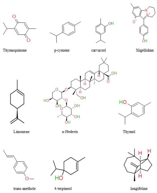 In recent years, significant advancements have been achieved in phytochemistry, and health supplements have gained prominence. The medicinal plant is called a chemical manufacturing industry, since it produces a variety of bioactive molecules such as alkaloids, saponins, oleoresins, resins, glycosides, sesquiterpene lactones, and oils [55]. NS’s most abundant chemical components are thymoquinone, α-phellandrene, thymol, proteins, oleic acid, and carbohydrates [7,56]. Previous research has isolated and characterized the primary components of black seeds, including palmitic acid, oleic acid, linoleic acid, and trans-anethole [57]. A study by Kumar et al. found Quiones (thymohydroquinone, thymoquinone, dithymoquinone) and phenolics [58]. Black seed oil was analyzed by Harzallah et al. and yielded 48 unique chemicals, the majority of which were thymoquinone [59]. According to another research, NS seeds contained various chemicals, most of which were monoterpene hydrocarbons. The constituents of NS seed are 0.4–2.5% essential oil, saponin, alkaloids, and 36–38% fixed oils [60]. Unlike most oils, fixed oil contains the unusual fatty acids C20:2arachidic and eicosadienoic [61]. Burits and Bucar et al. analyzed the essential oil using GC-MS. The major components were characterized as thymoquinone (27.8–57.0%), carvacrol (5.8–11.6%), ρ-cymene (7.1–15.5%), trans-anethole (0.25–2.3%), longifoline (1.0–8.0%), and 4-terpineol (2.0–6.6%). Dithymoquinone is easily formed when thymoquinone dimerizes [62]. The chemical structures of some main constituents of Nigella sativa seeds are shown in Figure 3.