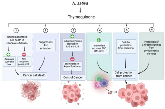 Interestingly, around 60% of anticancer medications have a natural origin [91]. We have compiled a summary of the many anticancer actions linked to NS in this section. Numerous bioactive compounds have been identified in NS seeds. The seeds comprise fixed and essential oils, alkaloids, saponin, and proteins [92,93]. NS’s critical bioactive component, thymoquinone (TQ), is responsible for the plant’s positive anticancer effect. In-vitro and in-vivo studies have demonstrated that TQ has decisive anticancer and antiproliferative activities against liver, blood, respiratory tract, kidney, colon, and prostate cancers. Combination cancer treatment with NS extract or TQ has been shown to reduce the toxicity of traditional cancer medications, while improving the quality of life for people with advanced cancer [94]. The anticancer activity of (R)-limonene was shown to be mediated by the process of apoptosis and the modification of polyamine metabolism. The compound limonene can trigger apoptosis in LS174T colon cancer cells via a mechanism that involves the mitochondria [95]. Researchers discovered that α-hederin caused a dose- and time-dependent rise in the death of murine leukaemia P388 cells. α-hederin has been shown to exhibit strong antitumor activity in vivo [96]. The efficacy of derivatives derived from TQ-bearing terpene-terminated 6-alkyl residues was evaluated in 518A2 melanoma and HL-60 cells. They discovered that the derivatives cause a slight rise in reactive oxygen species, a drop in mitochondrial membrane potential, and apoptosis linked to DNA laddering [97]. It was discovered that NS extracts, both aqueous and alcohol-based, were successful in vitro in deactivating MCF-7 breast cancer cells [98]. TQ has anti-neoplastic properties and promotes apoptosis in the HCT116 colon cancer cell line [99]. The study conducted by Salim et al. demonstrates the ability of the volatile oil of NS to inhibit colon carcinogenesis in rats at the post-initiation stage, without any observable adverse effects [100]. TQ was potent against the SW-626 colon cancer cells, and the results were similar to 5-fluorouracil in action on HT-29 cells [101]. Chehl et al. also suggested TQ as a new way to stop pro-inflammatory pathways. This idea is promising because it combines ways to control inflammation and help cells die [102]. The anticancer activity of TQ is attributed to potent antioxidant properties in normal cells, and prevents the formation of lipid peroxidation and radicals. TQ acts as a prooxidant, increasing ROS production and causing cancer cells to die after oxidative damage. TQ causes cancer cells to undergo apoptosis by upregulating the transcription factor p53, which promotes apoptosis. Upregulation of the proapoptotic p53 transcription factor is how TQ causes cancer cells to apoptosis. TQ is a cytoprotective molecule that mitigates the harmful effects of chemotherapy on healthy cells without interfering with the therapeutic effects of the drugs themselves in the fight against cancer. It stops cancer cells from dividing and halts the process of angiogenesis [94]. Figure 4. exhibits the possible anticancer mechanism of action of thymoquinone (TQ).