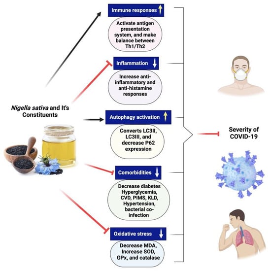 Different mechanisms of action of Nigella sativa and its secondary metabolites for COVID-19. NS seeds and its active constituents activate immune cells, make balance between Th1 and Th2 cytokines and initiate antigen presentation system, decreases inflammation, increases anti-inflammation and antihistamine responses. Black cumin bioactive compounds increase autophagy activation by the conversion of LC3II to LC3III, improving comorbidities situation in SARS-CoV-2-infected patients and help in decreasing oxidative stress.