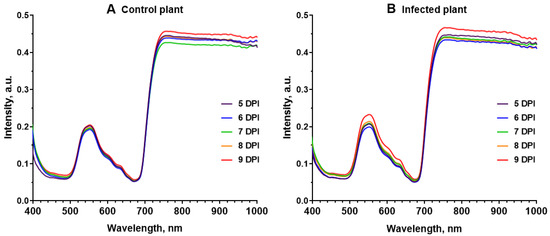 Dynamics of the reflectance spectra of the 10th leaf of the control plant (A) and the infected area of the 10th leaf of the inoculated plant (B). The curves in the diagrams represent average spectra (n = 6).