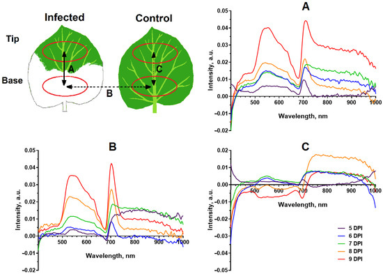 Dynamics of the difference between the spectra of the infected and healthy areas of the 10th leaf of the inoculated plant (A) (solid line), the difference between the spectra of the infected area of the inoculated plant and the base of the leaf of the control plant (B) (dashed line), the difference between the spectra of the base and the tip of the control plant (C) (dotted line). The curves in the diagrams represent the averaged differences between the spectra (n = 6). Top left image shows a diagram of the 10th leaf of the N. benthamiana plant indicating the regions of interest used in the experiment.