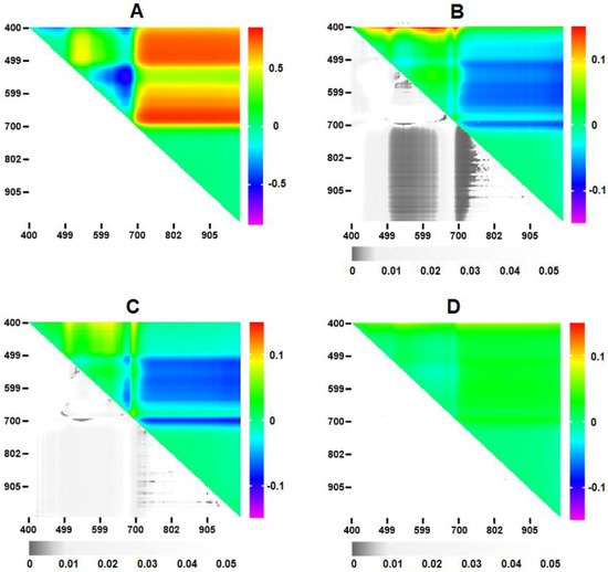 Distinctions in NRIs become visible when constructing heat maps of the differences in indices (ΔNRI) of infected and healthy leaves (Figure 4B–D). Three areas with the maximum differences can be identified on the heat map of ΔNRI between the infected and healthy parts of the leaf: (i) λ1 (400–410) nm and λ2 (550–700) nm, (ii) λ1 (510–630) nm and λ2 (750–1000) nm, and (iii) λ1 (690–710) nm and λ2 (750–1000) nm. The first area was also the maximum for ΔNRI between the basal and tip parts of the leaf of the control plant.