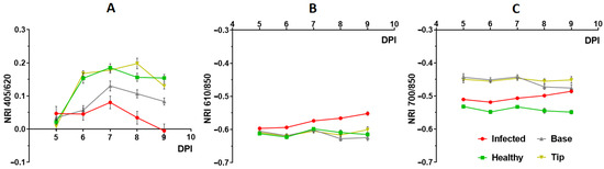 Dynamics of NRIs at 5–9 DPI in different areas of the 10th leaf of the inoculated and healthy plant. NRI405/620 (A), NRI610/850 (B), NRI700/850 (C). Mean values ± SEM are shown (n = 6).