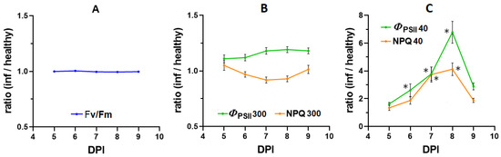 Dynamics of the ratio of the values of chlorophyll fluorescence parameters in the infected area to the healthy area of the 10th leaf of the inoculated tobacco plant. (A) Fv/Fm ratios. (B) Ratio of photosystem II quantum yield (ΦPSII) and non-photochemical fluorescence quenching (NPQ) determined at steady state (300 s after actinic light was switched on). (C) Ratio of ΦPSII and NPQ in the transition state (40 s after actinic light was switched on). Values are means ± SEM (n = 6). * indicates statistically significant differences between values in infected and healthy areas or differences in ratios from 1 (p < 0.05).