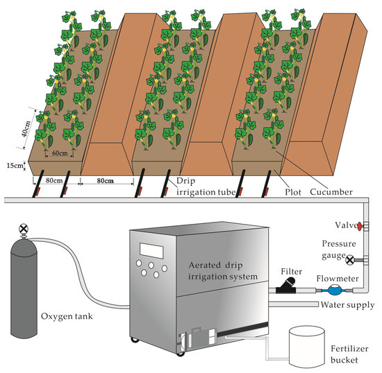 The field experiments were conducted on cucumber (variety of “No. 3966”, Cucumis sativus L.) in a solar greenhouse from 23 August 2020 to 10 January 2021, in Shouguang city, Shandong Province (northern China, 36°94′ N, 118°59′ E, altitude 49.5 m). The variety is mainly used for greenhouse cultivation, with high early yields, and 2~3 crops can be planted in 1 year. The study area belongs to a warm temperate continental monsoon climate, with a long-term annual mean air temperature of 12.7 °C, an annual mean precipitation of 594 mm, 2549 annual sunshine hours, and a 195 d frost-free period. The solar greenhouse covered an area of 950 m2 (95 m long × 10 m wide). As is common for the area, the greenhouse was configured east–west to maximize solar radiation and naturally cooled with roof vents. It is equipped with a meteorological observation station inside the greenhouse, which eliminates any interference from natural rainfall. The soil type is clay loam at 0–60 cm soil depths, with an average pH of 8.20, SOC of 15.8 g kg−1, total N of 1.22 g kg−1, total P of 1.08 g kg−1, and AK of 34.32 g kg−1. The average bulk density is 1.46 g cm−3, and the field capacity is 26.07%. The sand (0.02–2 mm), silt (0.002–0.02 mm), and clay (<0.002 mm) fractions of the soil were approximately 32.36%, 29.51%, and 38.13%, respectively. The experiment was set up with two types of irrigation and fertilizer application methods (ADI: 10 mg L−1 (O2), 20 mg L−1 (O3) irrigation water dissolved oxygen), and non-aeration groundwater treatment (O1, 5 mg L−1 dissolved oxygen). Two doses of N fertilizer were applied, including conventional N fertilization (N2, 360 kg ha−1), and 2/3 of conventional N fertilizer (N1, 240 kg N ha−1). There were six treatments, and each treatment had three replicates (Table 1). Aerated water was generated by a nano bubble generator for ADI; the equipment consisted of a circulating aeration unit, a ratio adjustment unit, a drip irrigation pressure stabilization unit, and a fiber optic oxygen spectrometer. The water supply pressure at the inlet of the pipeline was 0.1 MPa. The ADI system is irrigated when the appropriate dissolved oxygen (DO) value is reached.