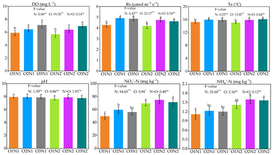 Effect of soil physicochemical properties under different treatments. The different letters indicate significant differences at 0.05. N and O represent the N application rate and irrigation method, respectively. N × O represents the effect of the interaction between the N application rate and the irrigation method. O1, O2, and O3 represent the 5, 10, and 20 mg L−1 irrigation water dissolved oxygen, respectively. N1 and N2 represent the 240 and 360 kg ha−1 N application rates, respectively. *, **, and *** identify significant differences at p < 0.05, p < 0.01, and p < 0.001, respectively, and ns identifies no significant.