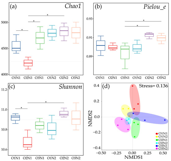 We conducted paired-end sequencing of community DNA fragments using the Illumina MiSeq platform. The 16S rRNA gene was quality filtered to obtain 961,144 high-quality sequence reads. Finally, 37,009 ASVs were obtained based on 97% similarity. ADI significantly affected the Chao1 and Shannon indexes of the rhizosphere soil bacteria with an insignificant effect on the Pielou_e index (Figure 4). Compared with the O1N1 treatment, the O2N1 treatment resulted in significantly reduced Chao1 and Shannon indexes (p < 0.05), with no significant differences in the Pielou_e index. In addition, the N2 treatment resulted in significantly greater Chao1, Shannon, and Pielou_e index values than the N1 treatment under ADI. The NMDS plot indicated distinct separation between bacterial communities of two irrigation methods (ADI (O2, O3), non-aeration (O1)), and N fertilizer application (N1, N2) treatments (except O3N1, p = 0.001), with significant differences under treatment (O1N1 vs. O2N1, O1N2 vs. O3N2, and O3N1 vs. O3N2) (ANOSIM, Table 2).