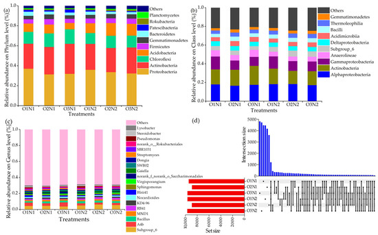 Composition of soil bacterial community at the phylum (a), class (b), genus (c) classification levels and Upset diagrams (d) under different treatments.