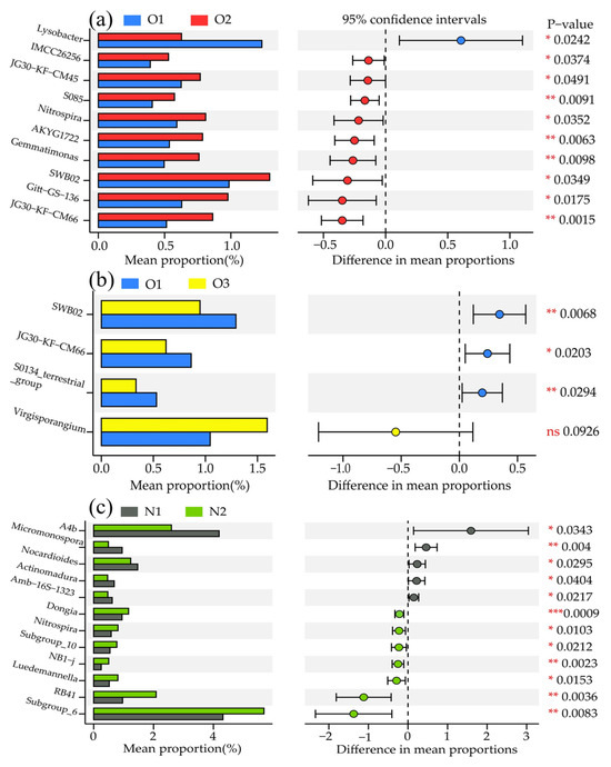 The top 50 significant differences classification levels of bacterial genus based on the STUDENT’s t-test under different treatments. (a–c) indicate the difference species between O1 vs O2, O1 vs O3, and N1 vs N2 treatments, respectively. *, **, and *** identify significant differences at p < 0.05, p < 0.01, and p < 0.001, respectively, and ns identifies no significant difference.