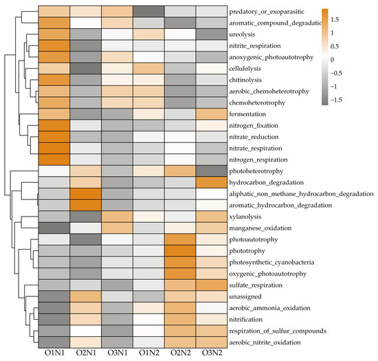 The top 30 bacterial community functions identified by FAPROTAX based on ASVs are presented in Figure 7. Dominant functional groups included chemoheterotrophs (15.38%), aerobic chemoheterotrophs (14.08%), nitrification bacteria (2.55%), aerobic-ammonia-oxidation bacteria (1.94%), aromatic-compound-degradation bacteria (1.29%), and nitrate-reduction bacteria (0.98%). Overall, under two N applications, bacteria capable of nitrification, aerobic-ammonia-oxidation, aerobic-nitrite-oxidation, hydrocarbon degradation, etc., were more abundantly noticed in ADI (O2 and O3) treatment compared with the O1 treatment. In contrast, fewer groups with capacities of anoxygenic-photoautotroph, nitrate-respiration, nitrite-respiration, etc., were observed. In addition, under the O2 treatment, N2 promoted more abundant groups capable of ureolysis than N1.
