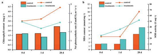 Effects of salt stress on photosynthetic characteristics and membrane protection system of S. apetala. (a) Effects of salt stress on chlorophyll content and net photosynthetic rate. (b) Effects of salt stress on MDA content and SOD activity. MDA, malondialdehyde; SOD, superoxide dismutase. Histogram represented chlorophyll content (a) and MDA content (b); line chart represented net photosynthetic rate (a) and SOD activity (b).
