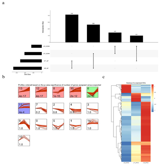RNA-seq library construction and sequencing to 6 GB size of data was carried out according to the methods described by Li et al. [69]. RSEM [70] was used to determine the short-read data (length of 150 bp) and using the resulting full-length transcripts as a reference sequence. The counts of transcript isoforms were converted into fragments per kilobase of transcript per million mapped reads (FPKM) values, with the help of following formula: FPKM = (transcript reads) × 109/(transcript length × total mapped reads in run). Differential gene expression was determined on the basis of the criteria of |log2(Fold change)| ≥ 1, p-value < 0.01 and Q-value < 0.05, and the DEseq2 [18,71] software was utilized for an inter-group differential analysis. The differentially expressed genes overlapping in both LT1 and LT2 were defined as co-expressed DEGs for subsequent analysis. The library construction and sequencing were carried out by Beijing Genomics Institute (BGI), China.