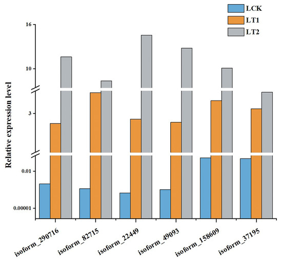 To compare the gene expression levels and identify DEGs, the statistic of number of fragments per kilobase of transcript per million mapped reads (FPKM) was utilized. A total of 4712 DEGs (|log2FC| ≥ 1, p-value < 0.01, Q-value < 0.05) were identified during the salt stress response of S. apetala. Among them, 1653 were up-regulated and 1500 were down-regulated in LT1 (1 d), while 1645 were up-regulated and 844 were down-regulated in LT2 (28 d). As indicated in the Venn diagram, 930 genes were expressed differentially at both the time points and were defined as co-expressed DEGs. So, we hypothesized that these (930) genes might play a key role in the response to salt stress in S. apetala (Figure 2a). Short-Term Sequence Expression Miner (STEM), a Java-based software, is the first program to analyze short-term sequence microarray gene expression [18,19]. In order to understand the expression profile of co-expressed DEGs, the STEM software (v1.1) was used and six significant profiles (p< 0.05) from three clusters were identified (Figure 2b,c). We randomly selected six co-expressed DEGs and examined their transcript levels via quantitative real-time PCR (qRT-PCR) and confirmed a concordance with the expression values from high-throughput sequencing data (Figure 3).