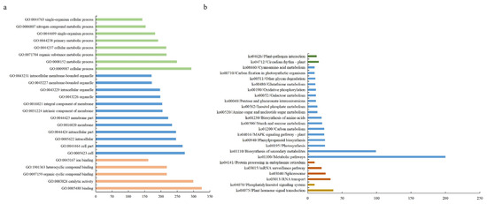 Co-expressed DEGs serve as a reflection of the biological response of organisms to varying conditions [20]. Studying co-expressed DEGs contributes to the identification of novel functional genes, construction of biological pathways and establishment of regulatory networks for transcription factors. To investigate the mechanism of response for S. apetala leaves to salt stress, a Gene Ontology (GO) analysis was conducted on 930 co-expressed DEGs. A total of 715 DEGs were successfully annotated in the GO database (Figure 4a). The significantly enriched subcategories in biological processes were mainly related to biological metabolism (26.8%) and cellular processes (31.5%). In terms of cellular components, the subcategories mainly related to cellular components (28.6%) and cells (29.4%) were significantly enriched. In terms of molecular functions, the significantly enriched subcategories were mainly related to catalytic activity (32.2%) and binding (34.9%).